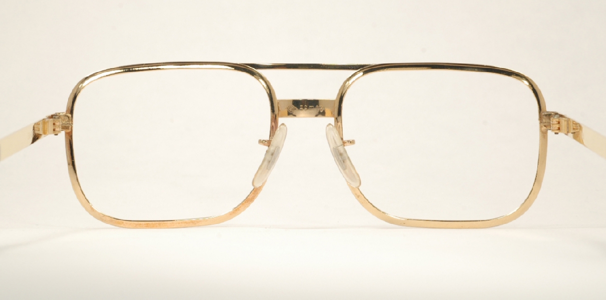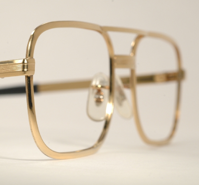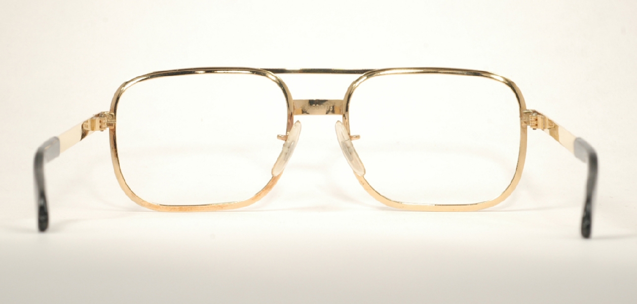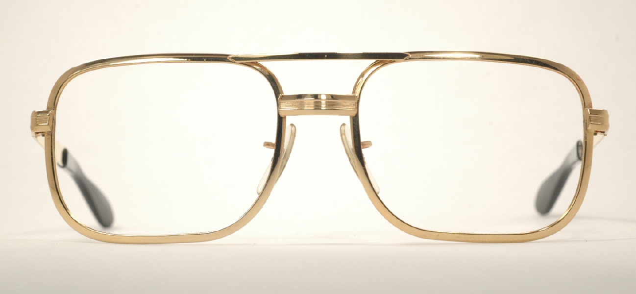 | These classic vintage gold metal eyeglasses are in mint condition and ready for prescription lenses or sunglasses. The bridge is marked ''56 - 18'' and the arms read ''USA 5 1/2''.  |