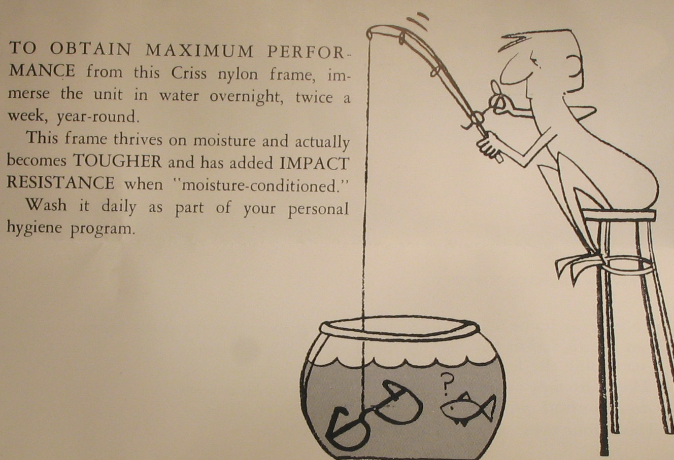 Criss supplied frames to the US military and still does. Their frames are made of Nylon instead of the usual eyeglasses frame material, which is called ''Zyl'' plastic. Nylon is much, much more flexible than Zyl, which will bend to a point, but then breaks unless heated in a frame warmer. Nylon, on the other hand, can be nearly twisted