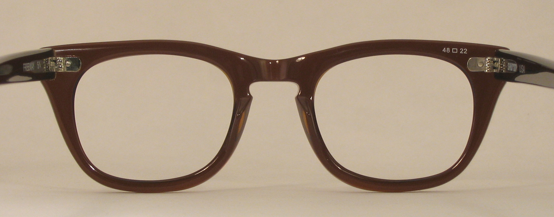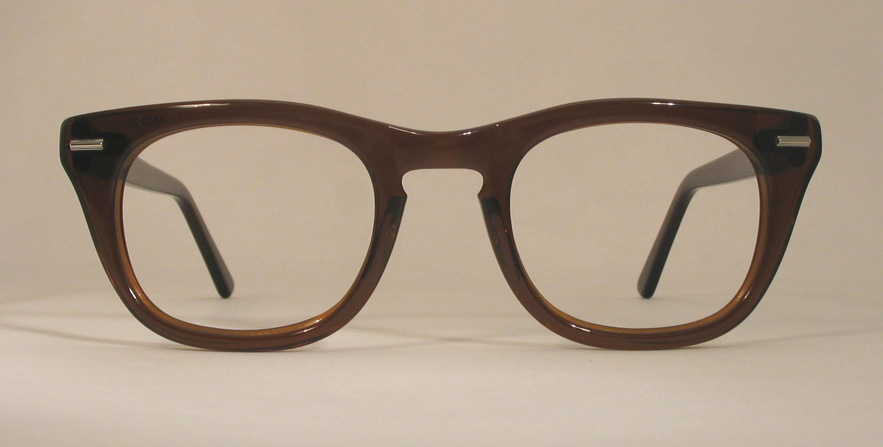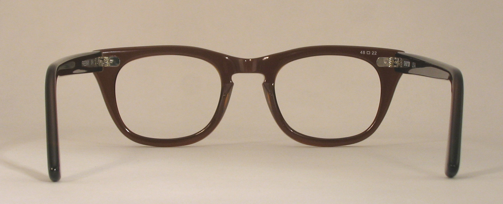 These classic men's brown smoke plastic eyeglasses are brand new, mint condition and ready for prescription lenses or sunglasses. They're offered in several frame sizes. The frames in the photos are marked ''48 22'' and the temples are marked ''SHURON USA 5 3/4''. The plastic has a nice sheen and the metal rectangle shields shine. Please note: These are running a little small in the lens width as of late 2022, smaller than the stated lens width by about 1 mm.