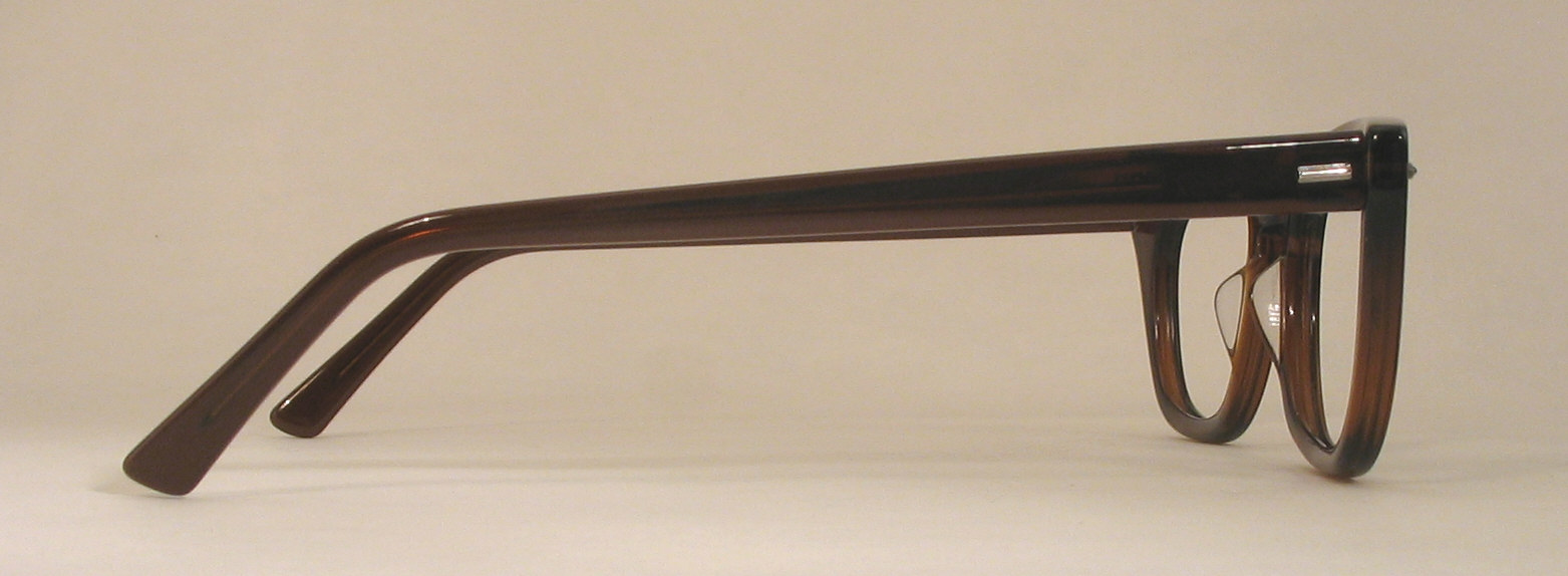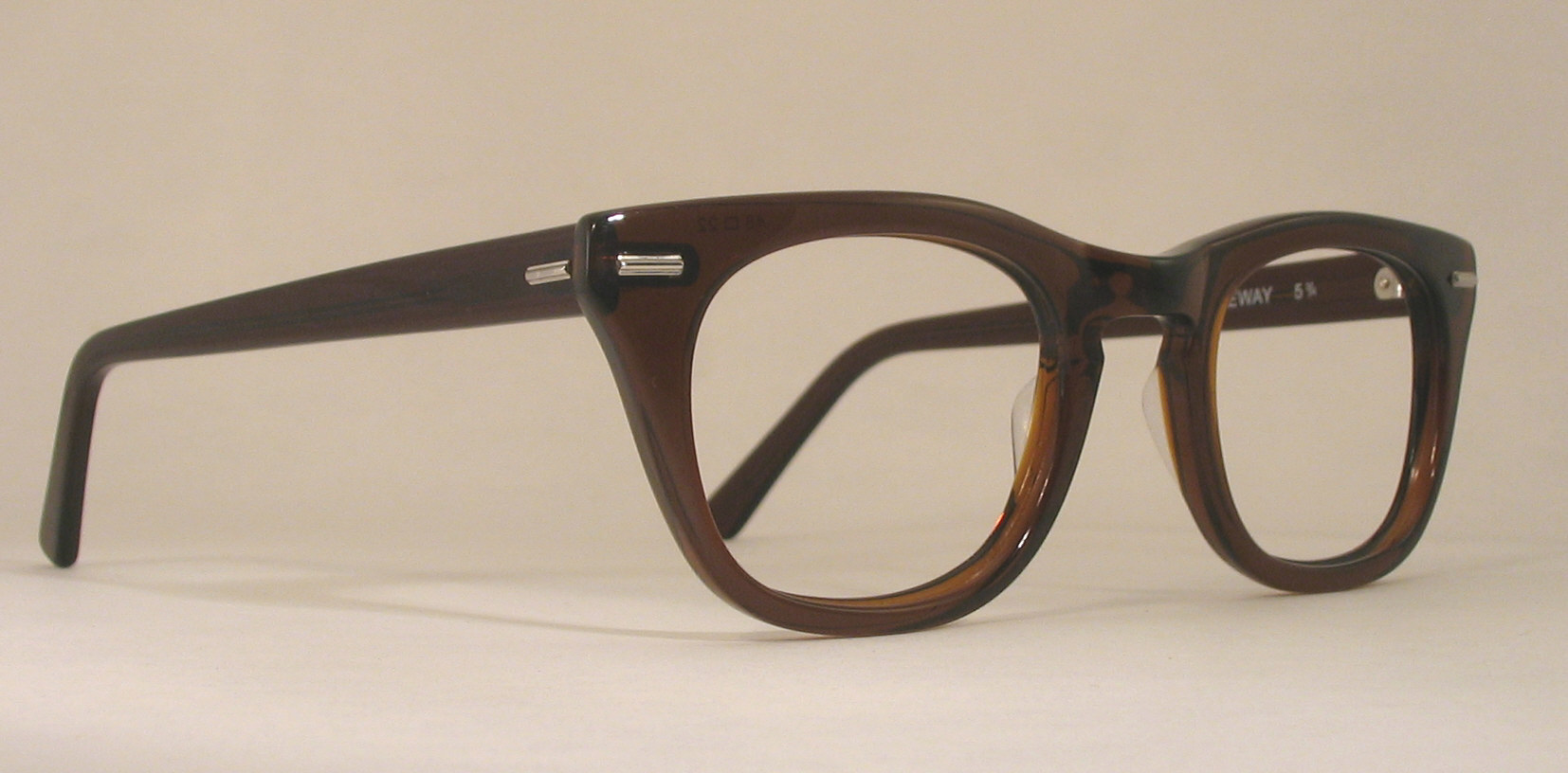 These are the classic Shuron Freeway frame in dark, brown smoke Zyl, optical jargon for plastic. These are brand new, though they're same as they've always made them: keyhole bridge, flared hornrims, rectangular silver shields on the fronts and sides, and strong five-barrel hinges. Real classics.
