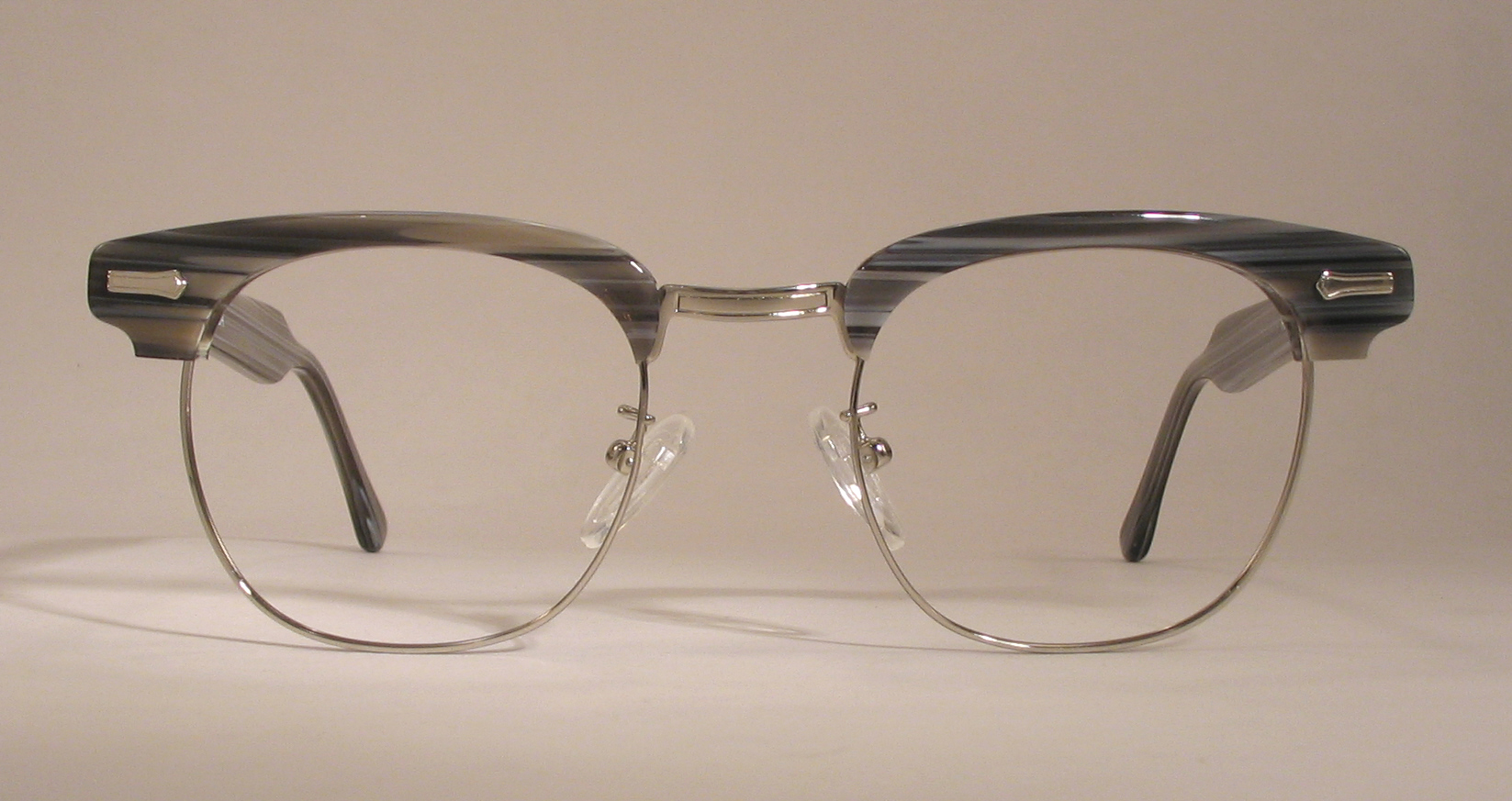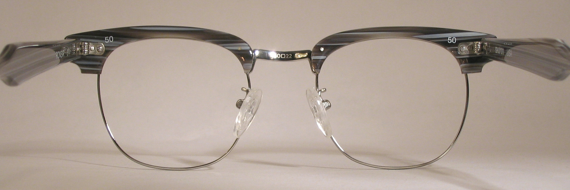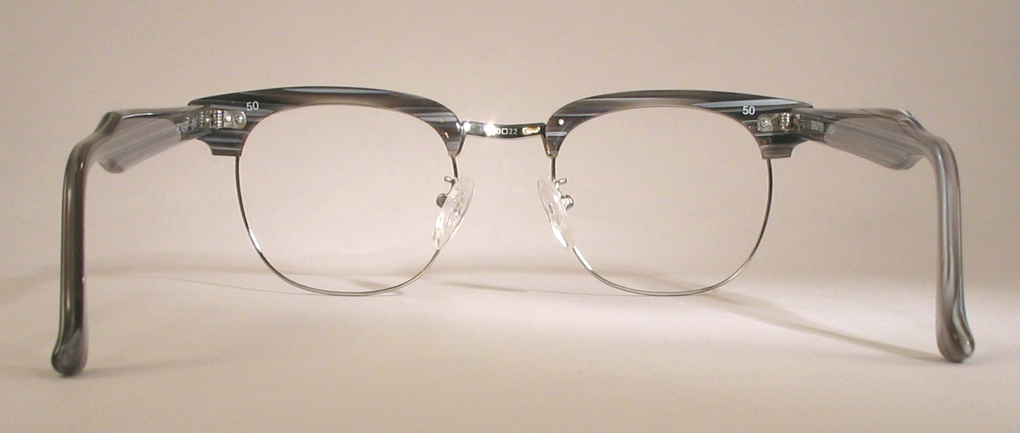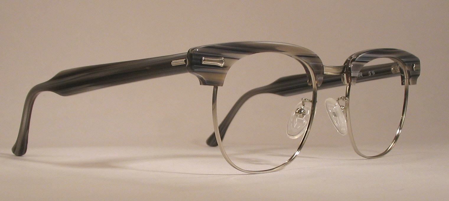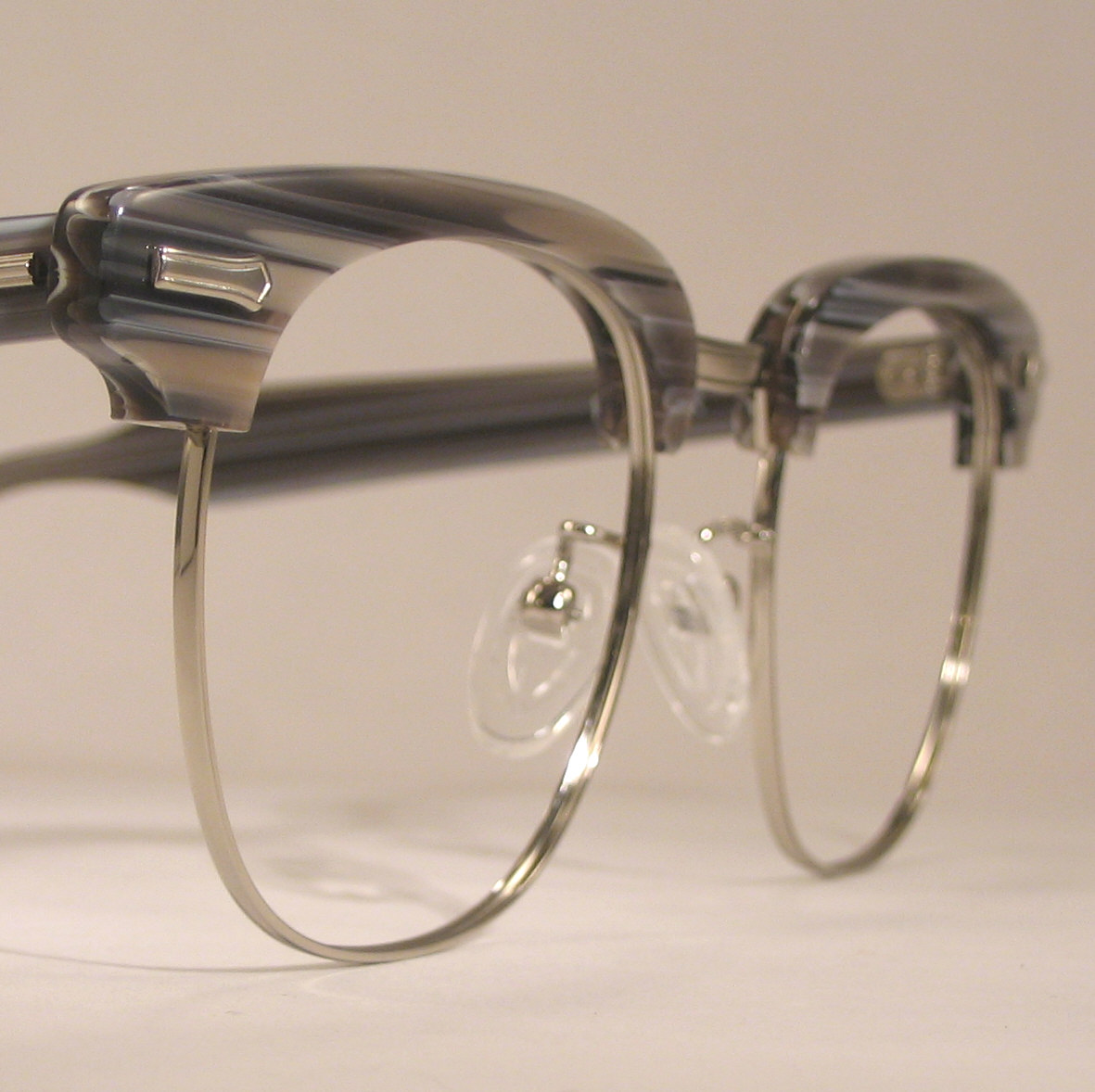 These are brand new, though made pretty much just like they've made them back since the 1950s and I have to tell you, they really are well-made glasses. (This is from someone who handles mostly vintage frames from the golden age of American craftsmanship, so I really have seen some of the best frames ever made, or at least I like to think so!) The finish on the new Ronsir frames is always well-done, the screws are cooperative and the plastic is tough stuff. They do a good job on the little details, too, no dangling plastic machine fragments or big solder blobs I sometimes see on contemporary frames. So, since these are brand new, is anything different from the Shuron Ronsir of yesteryear? The nose pads changed from bakelite / mother of pearl back in the late Forties, so they've been using clear ones for a long time. The nose pad fittings were recently changed, making it much simpler to find replacement pads. The plastic briar pattern has changed over the years and a 1950 grey briar will not be the same as a 1955 grey briar and so on. Besides those minor differences, they really are pretty much the same as they've always been! Great glasses, top notch!