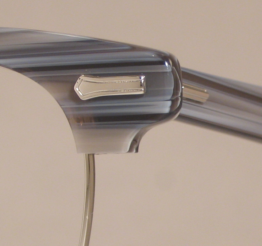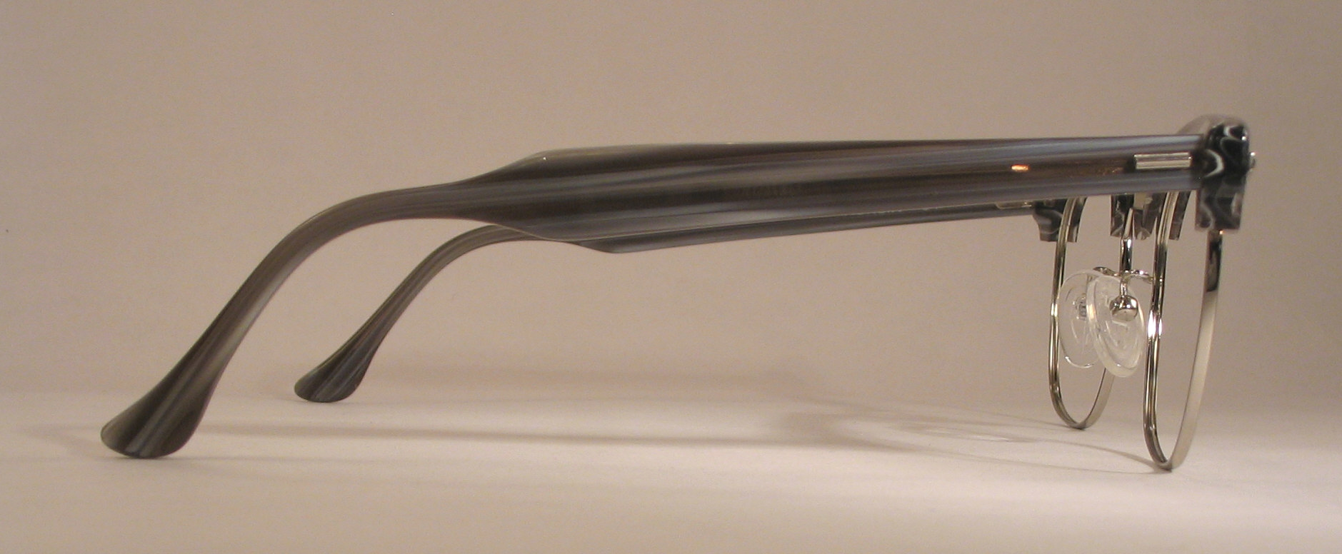 TEMPLES: In the grey briar, I stock the standard adult men's temple length of 5 3/4 inches (145 mm) and the slightly longer 6 inch (150 mm) in both the ''Taper'' and the ''Slipper'' styles shown below. All the other sizes are available by order, quickly. The Slipper style is associated with earlier models of the Ronsir and other makers also used the same style early on in the history of combination frames. The Taper style came just a little later. There are also cable temples, one called the ''Relaxo'' and similar in shape to the ''Slipper'' and an all-metal cable temple Shuron calls the ''Aztec''.