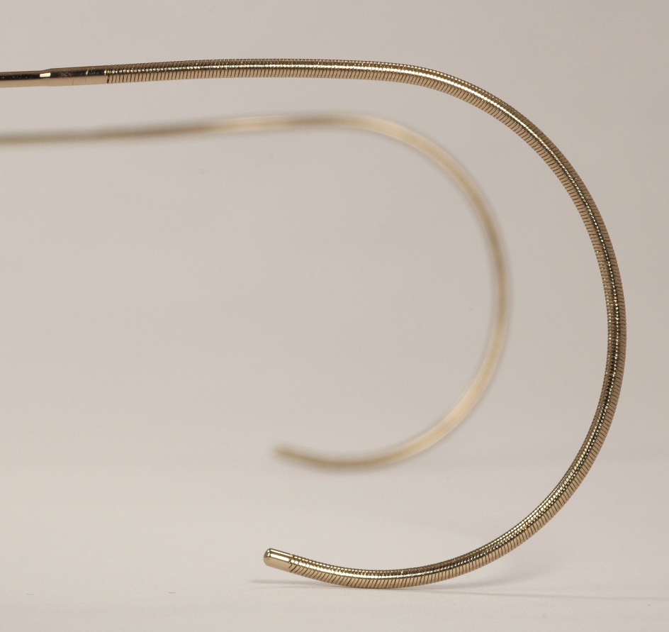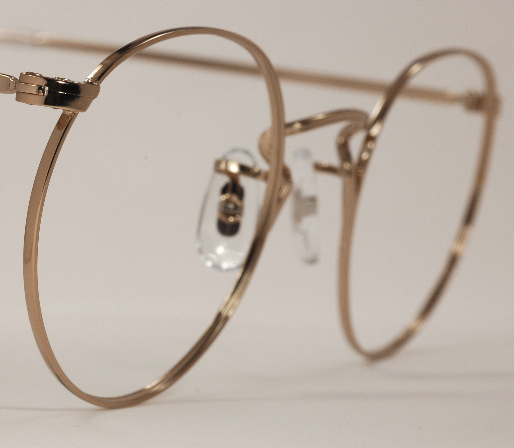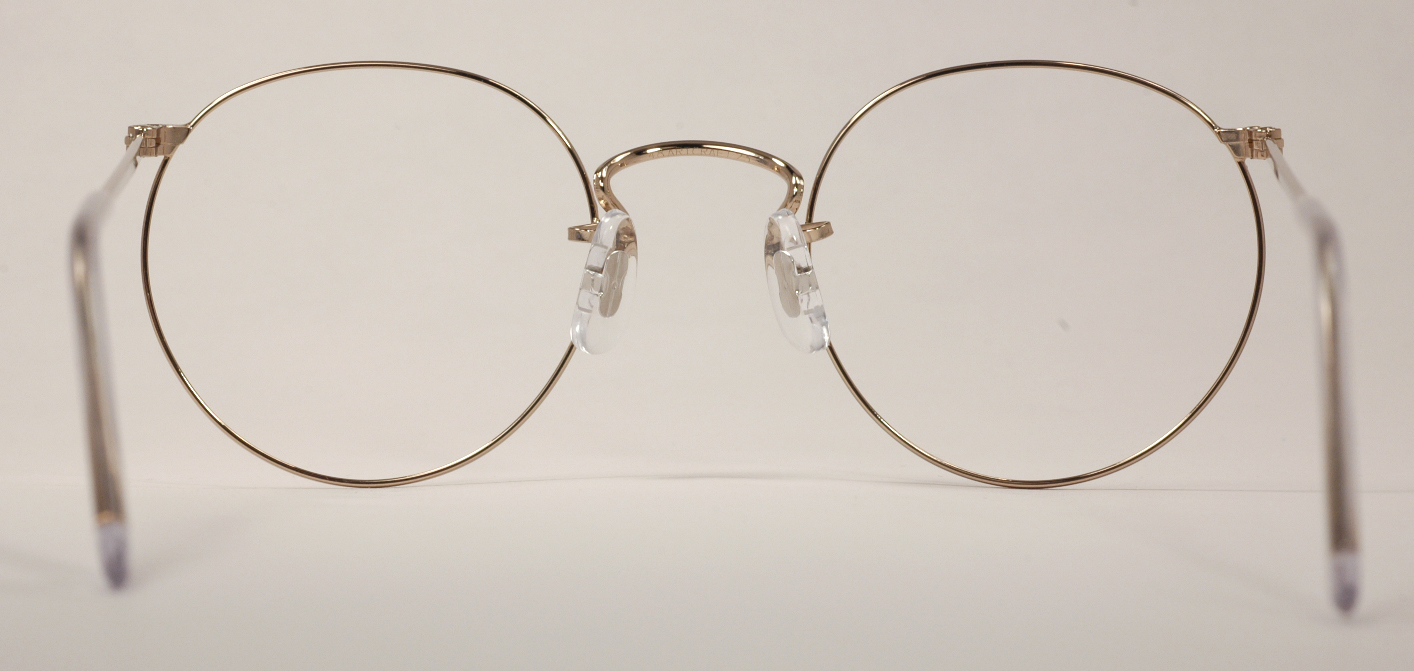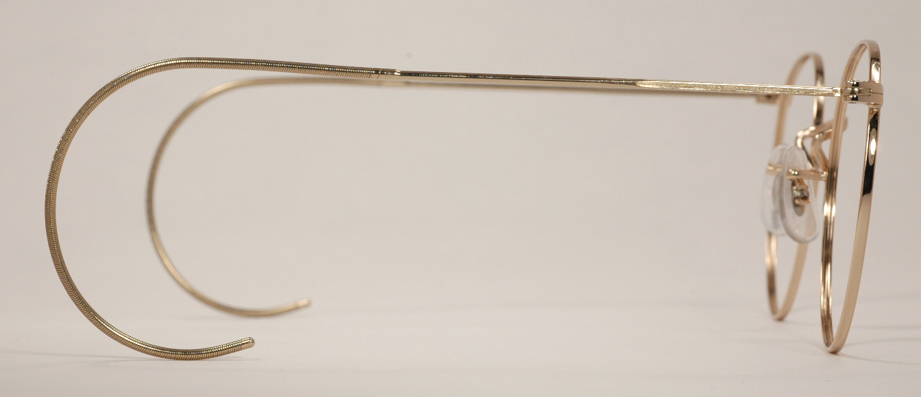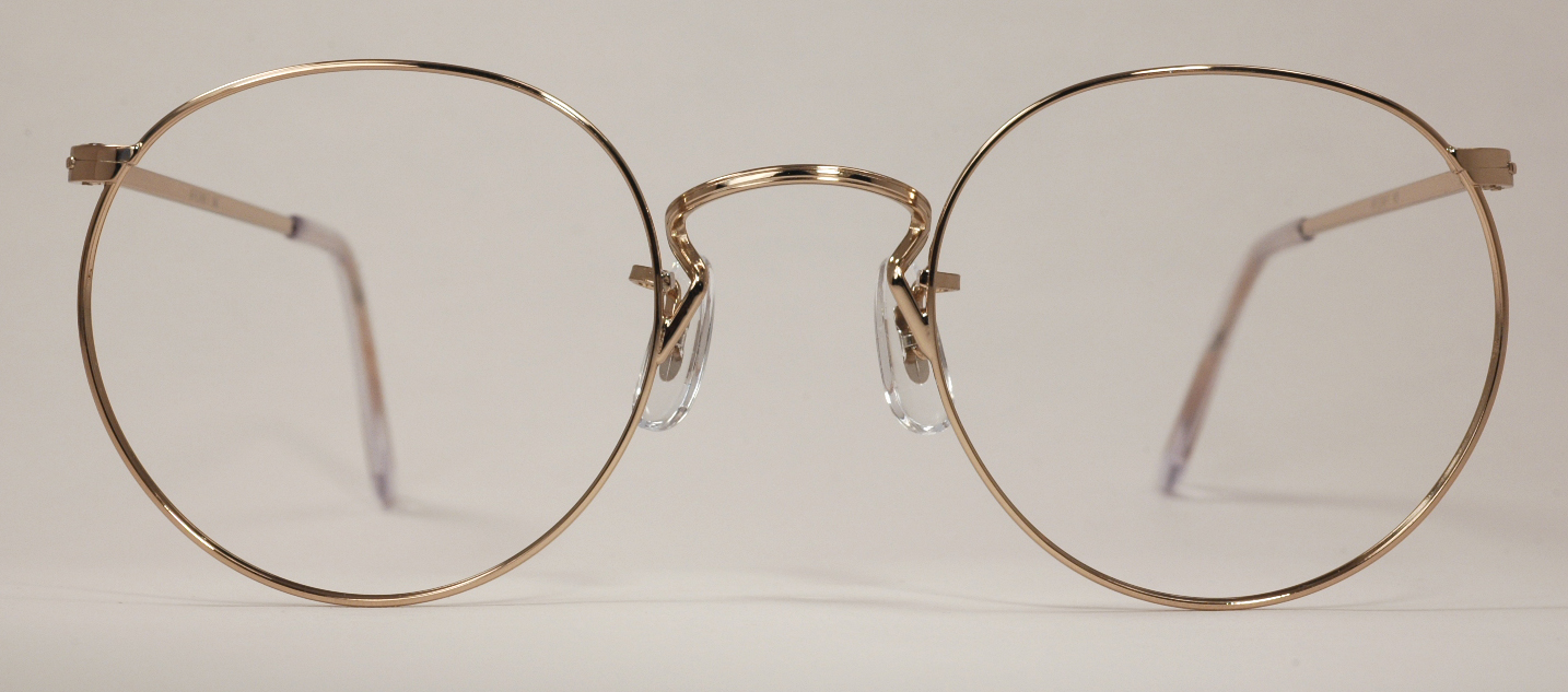 These classic gold wire rim eyeglasses are brand new, mint condition and ready for prescription lenses or sunglasses. They're available in several frame sizes and with both skull temples (paddle-style arms) and cable temples (the traditional curled style of arms). The frames shown are marked ''48 ART CRAFT 23'' and the arms read ''ART CRAFT - U.S.A.'' The other sizes are also marked according to their sizes. The bridge is detailed with a simple pair of straight lines, very fine and well-done and the rest of the frame is without design engraving.