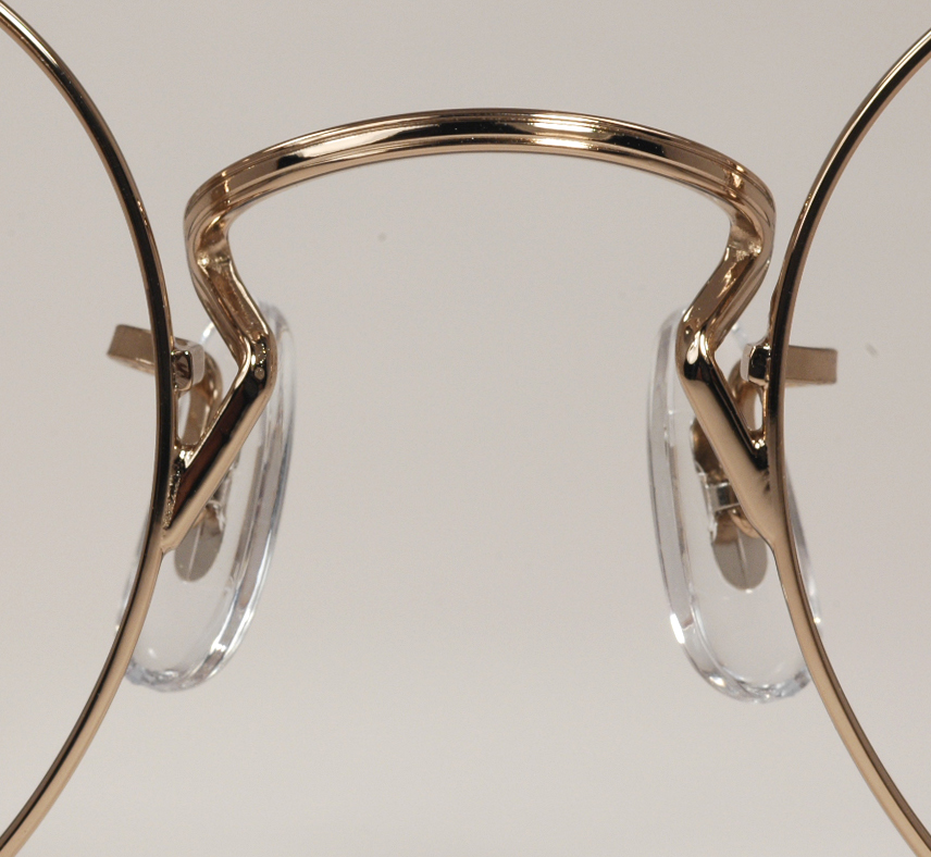 These are brand new Ful-Vue frames from a long-famous name in the optical business, Art Craft Optical, located in Rochester, New York since their founding in 1918. This frame design is a real classic, unchanged since the 1960s and really not much changed since it's introduction in the 1940s. They have a really nice yellow gold finish over a stainless steel base. The bridge shape is the same one they've used forever and the clip-style nose pads are some of my favorites, simple to find and replace. The official frame model name is the ''Art-Bilt 100A-ST Ful-Vue'' but you'll also hear them called ''P3 frames'', after the military jargon for this lens shape. Nice frames, real classics!