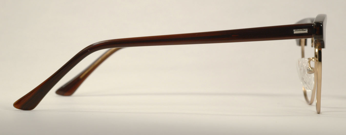 This is the Shuron Ronsir ''Timberline'' frame. The brows and temples are Zyl, in a color Shuron calls ''Oak'', a darker tortoise shade, all over a gold chassis, a great color combination. The Timberline is an early 1960s introduction, the streamlined version of the traditional Ronsir, almost the same frame, but without rivet shields on the front corners. They're well-made, classy frames and come in a variety of colors and sizes. The Timberline Oak can also be made with silver rims, bridge and details. Please email to make arrangements for those.