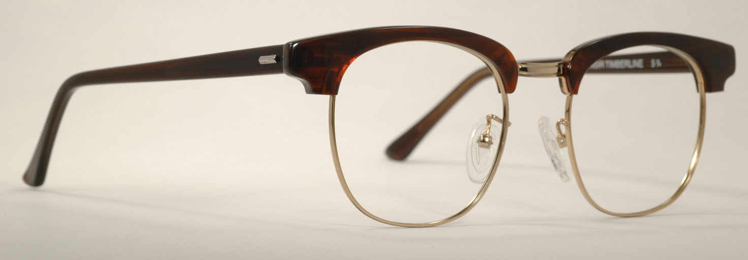 These classic oak gold eyeglasses are brand new, mint condition and ready for prescription lenses or sunglasses. The frames shown in the photos are marked ''50 - 20'' on the bridge, ''50'' on the brows and the temples read ''SHURON USA RONSIR TIMBERLINE 5 3/4''. Other sizes are marked according to their respective sizes.