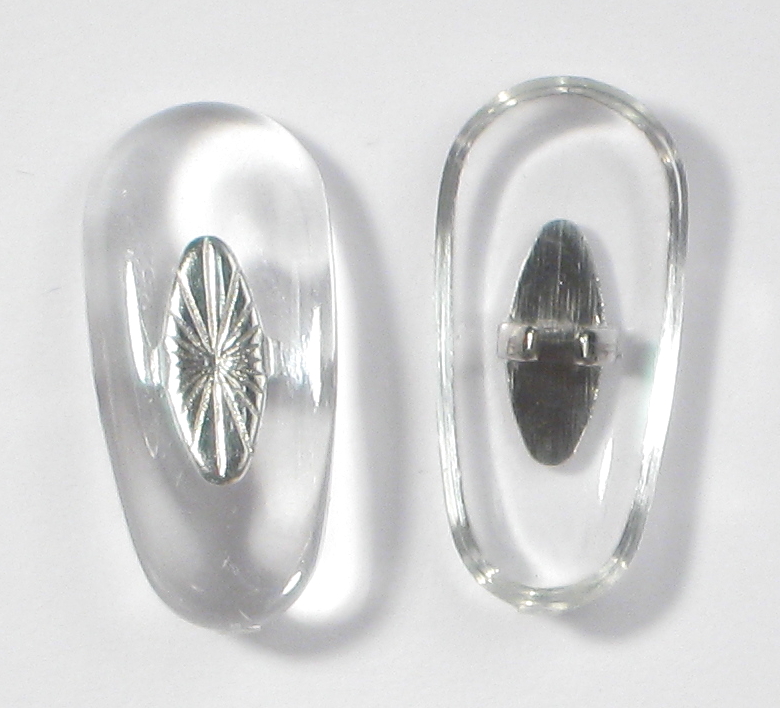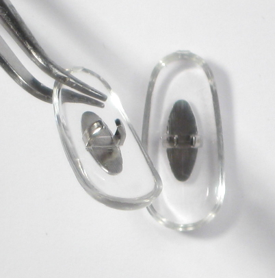 EYEGLASS NOSEPAD photo, under 350 kb EYEGLASSES NOSE PADS photo, under 350 kb This style of nose pad was once the main style used on most glasses. They are often called clip, clip-on or clamp-on nose pads and they are sold by the pair.  These are made of clear acetate, which is the same firm material from which most plastic eyeglasses are made. Nose pads size is measured the long way and these are 15 mm (9/16 inches) long. As the names suggest, they clip onto the ends of the nose pad arms on your glasses.