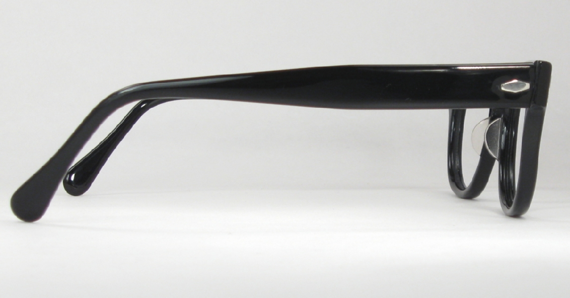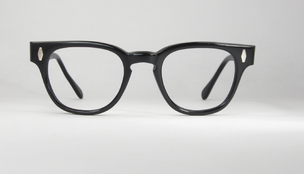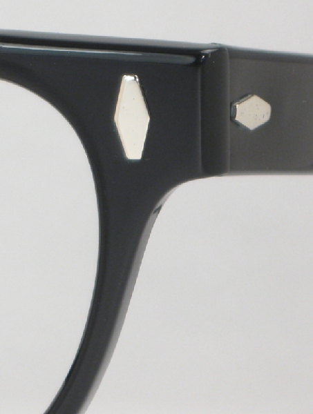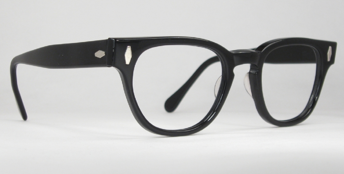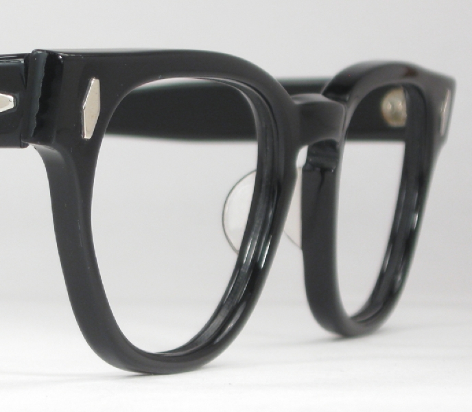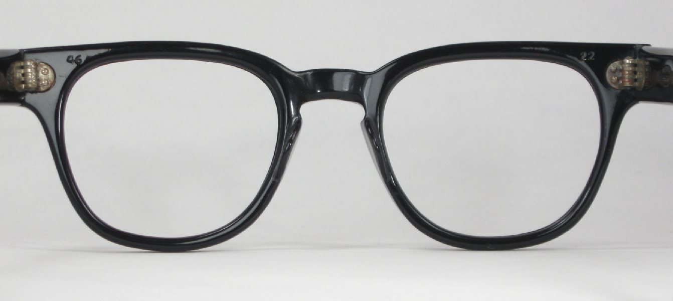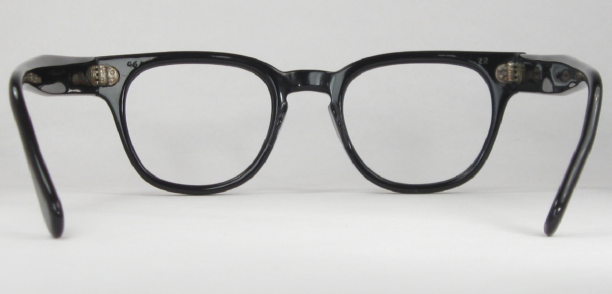 These classic men's black plastic vintage eyeglasses are in excellent condition and ready for prescription lenses or sunglasses. The frame is marked ''46 22'' and the arms read ''6 USA''. The plastic has a nice sheen with no cracks, crazing or discoloration and the rivets shine bright. Really nice pair of frames, likely from the early- to middle 1960s. These are only marked for the USA and don't have a maker's mark, so I can't say who made them, but they're nice frames. Those elongated hexagon rivets are very cool and a shape I've not seen before, always fun to find something unusual. They have a keyhole bridge with deep, clear bridge tabs, broad temples and strong, tight seven barrel hinges, no wobble. Great frames, ready to go!