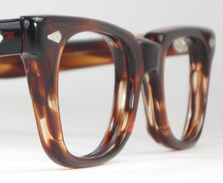 Very cool, very strong frames, never worn, never had lenses. These are by Style Rite Optical and date from the later 1960s. Strong, thick rims, great dark tortoise zyl,