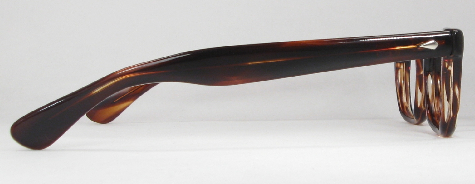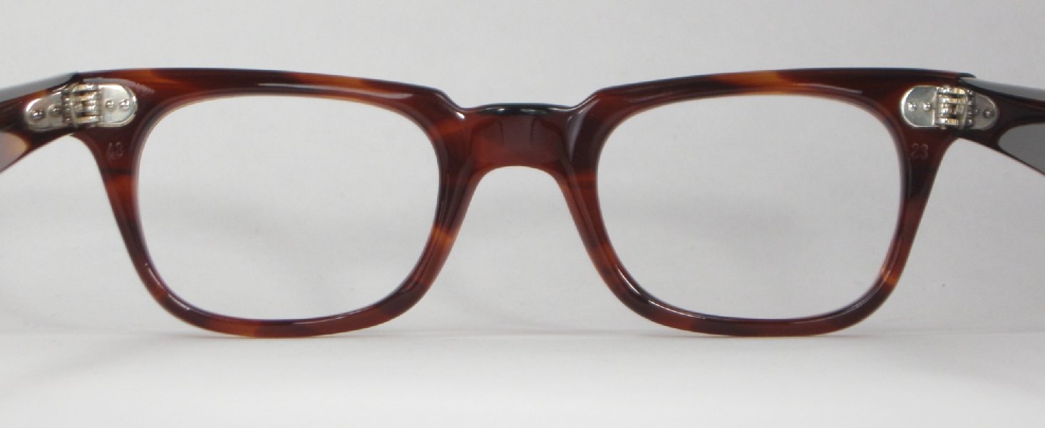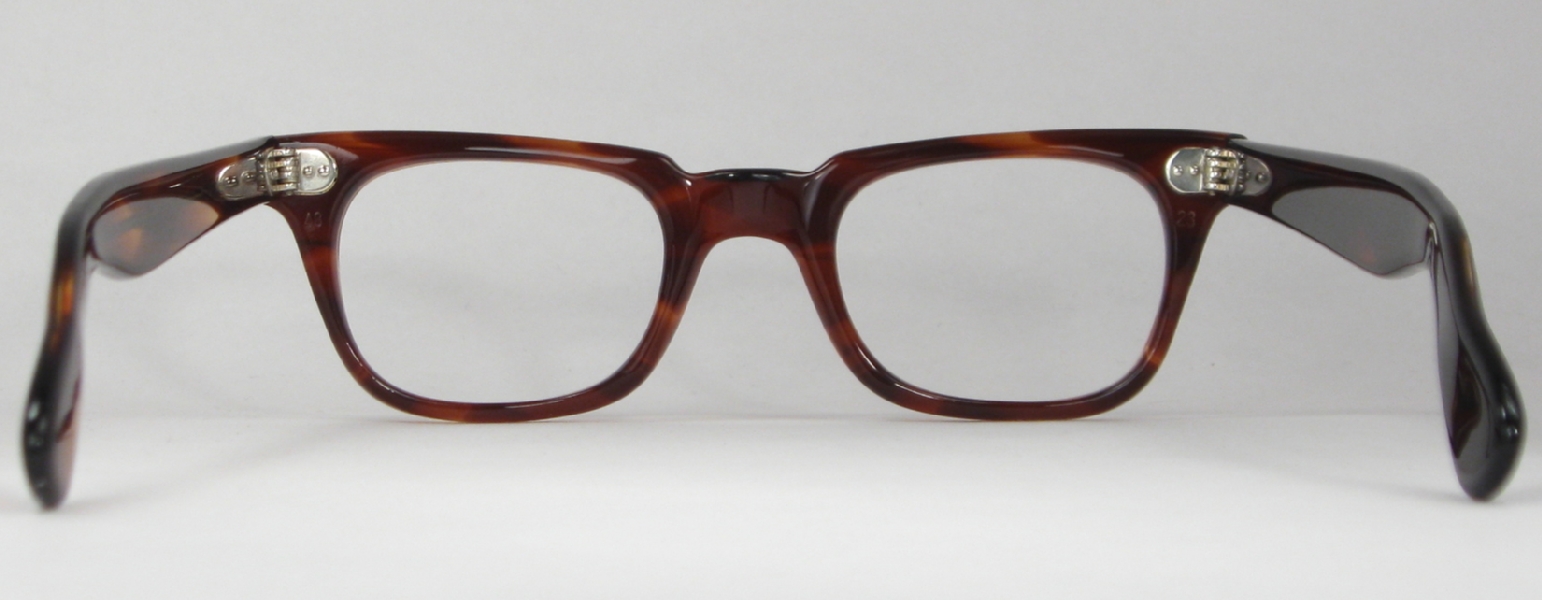 | These classic men's tortoise plastic vintage eyeglasses are in mint condition and ready for prescription lenses or sunglasses. The frame is marked ''48 23'' and the glasses are otherwise unmarked. The plastic has a nice sheen with no cracks, crazing or discoloration and the