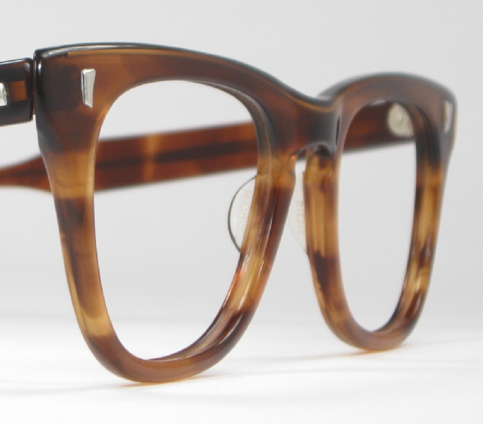 These are great Wayfarer-inspired frames by Marine, a prolific maker from the 1960s. They're unused vintage stock, never worn, never lensed. Nice keyhole bridge, cool shaped temples, strong seven-barrel hinges and the zyl is a really nice tortoise pattern and color. Most all plastic frames have a wire inside the temples, but Marine made their frames with a wire inside the frame, too. This makes for a very strong bridge and frame front that holds it's shape. Note the detail on the wire inside the temples, a nice detail we don't see these days. Great frames in a generous vintage size, ready to go!