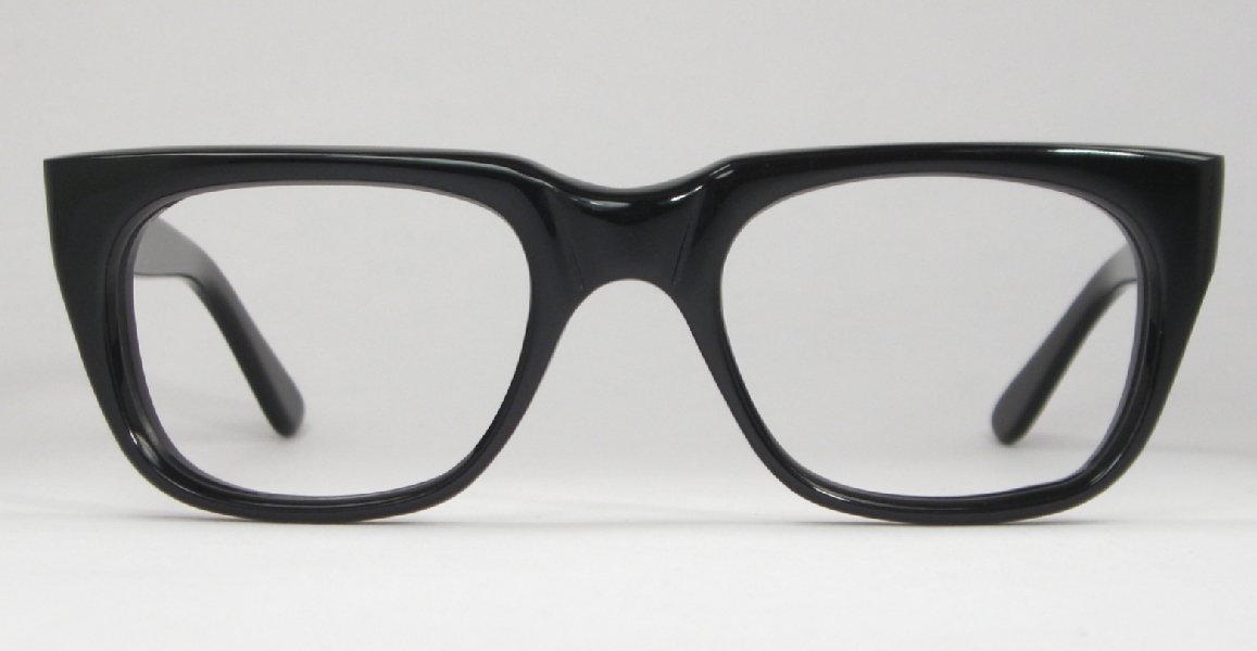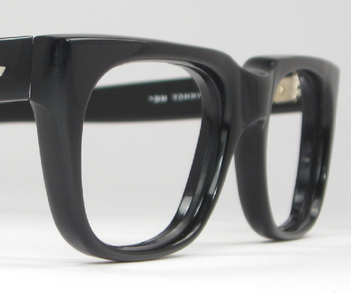 This is the Tommy model from Shane-Michael Optical in classic black, dating from the middle to later 1960s. They've never been worn and never had lenses. Nice smooth bridge, stout five barrel hinges, very cool details on the temples and thick zyl throughout. Super frames, ready for lenses and