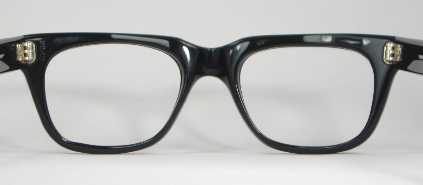 | These classic men's black plastic vintage eyeglasses are in mint condition and ready for prescription lenses or sunglasses. The frame is marked ''50/22'' and the arms read ''FRAME FRANCE SM TOMMY''. The plastic has a nice sheen with no cracks, crazing or discoloration and the rivets shine bright.  |
