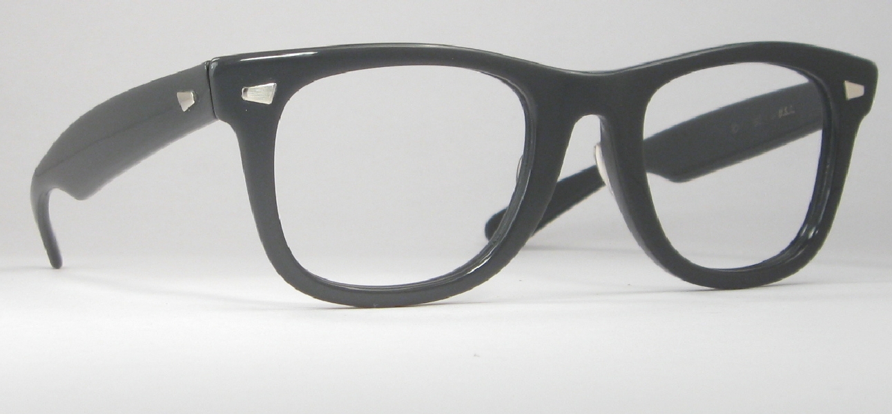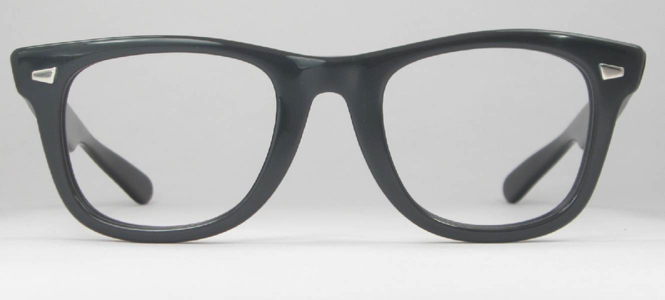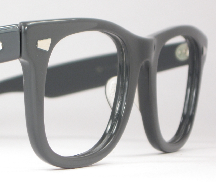 | These classic men's grey plastic vintage eyeglasses are in mint condition and ready for prescription lenses or sunglasses. The bridge is marked ''50 - 22'' and the arms read ''FOREMOST 145 U.S.A.''. The plastic has a nice sheen with no cracks, crazing or discoloration and the rivets shine bright.  |
