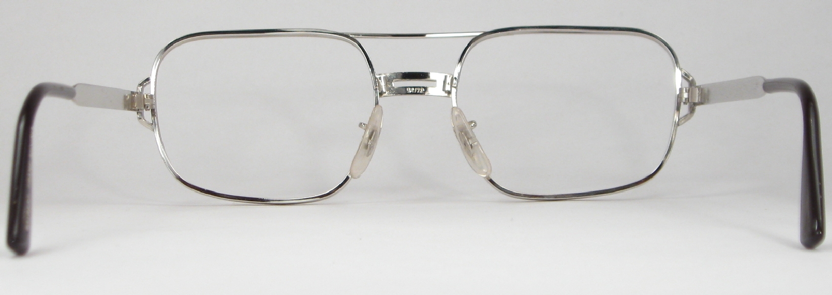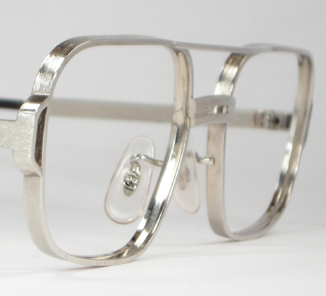 Great frames by Raybert, a popular maker from the 1960s and 1970s. These are the Signabar model and they're unused vintage stock, never been worn, never had lenses. From the front the rims look like a typical thickness for a metal frame, but look at them from the sides! Very thick rims, with a very heavily brushed finish, very