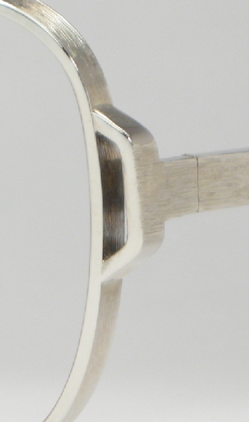 mod, not to mention tough, too. That thick brushed finish, almost a simulated wood grain, is continued on the temples, hinges and the bridge. Really a cool finish and check out the openings at the hinges, a neat design element and very unusual. The screws are all tested and working just as they should be, they have strong three-barrel hinges, original clip-on nose pads, easily replaced and that great finish. Super frames, ready for lenses and years of cool service!