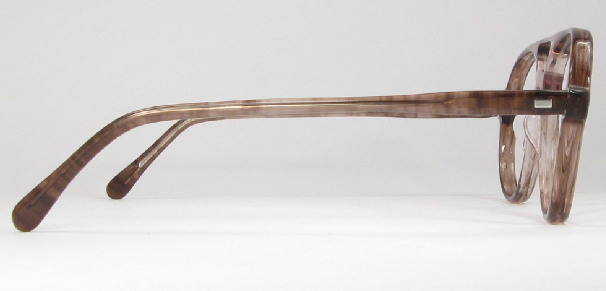 smoke brown, very cool color. The frames are unused vintage stock, never worn, never had lenses. They even come with their original paper sleeve, as shown. They're a classic teardrop aviator shape, with a slight suggestion of geometric shaping in the lower corners of the teardrop, a fun detail. The hinges are five-barrel, nice and tight, no wobble, and they're attached to the temples with real-deal rivets with a nice, silver rivet head. The temples also have a little geometric shaping, both near the hinge and at the tips. Super frames, ready for to go!